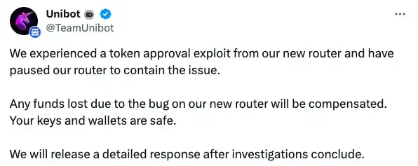 Unibot 官方发布公告称,本次攻击主要是新的路由器(router)出现代币批准漏洞,目前已经暂停了路由器;由于该漏洞造成的任何资金损失都将得到补偿,Unibot 将在调查结束后发布详细答复。