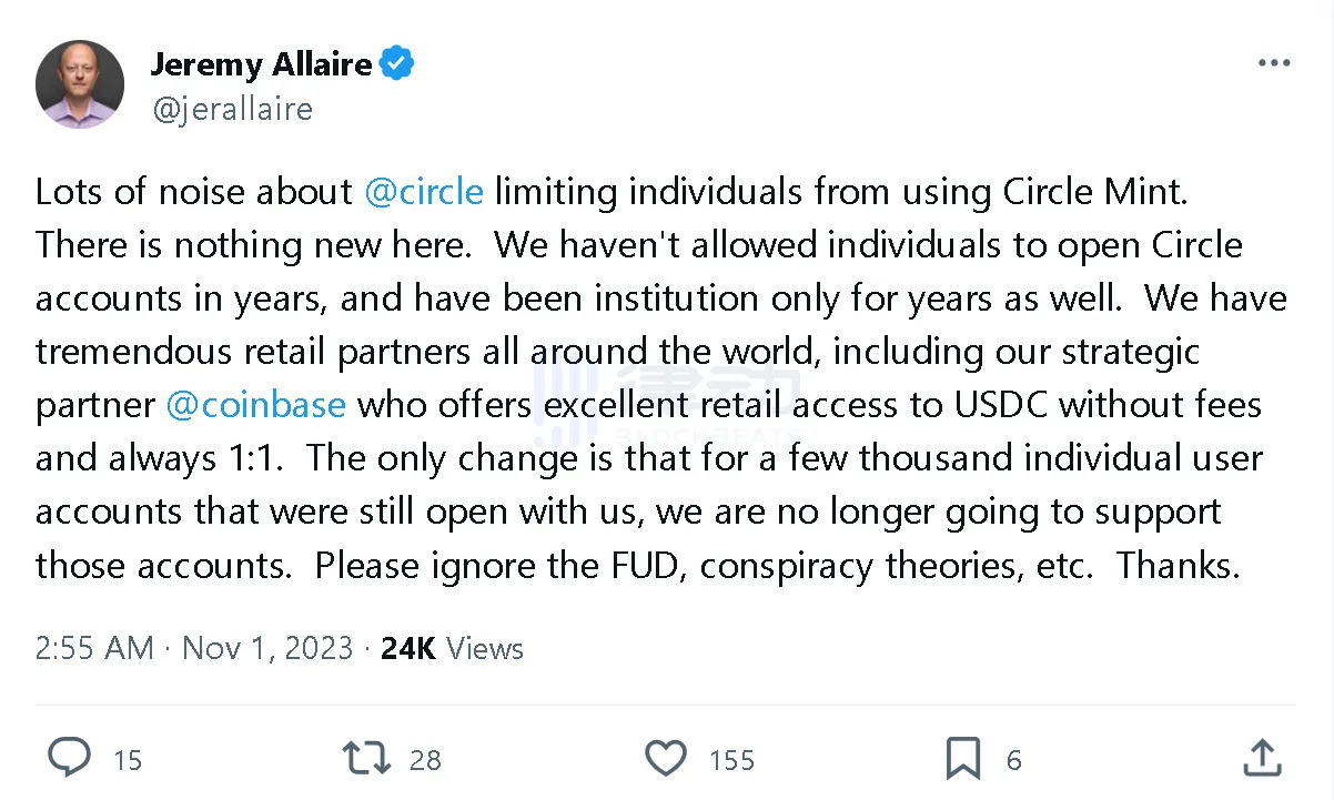 然而今日对于 Circle 关闭消费者账户这一举动,Jeremy Allaire却在推文中表示「Circle 已经很多年不允许个人开设 Circle 账户了。」并特意提醒网友忽略 FUD、阴谋论等。