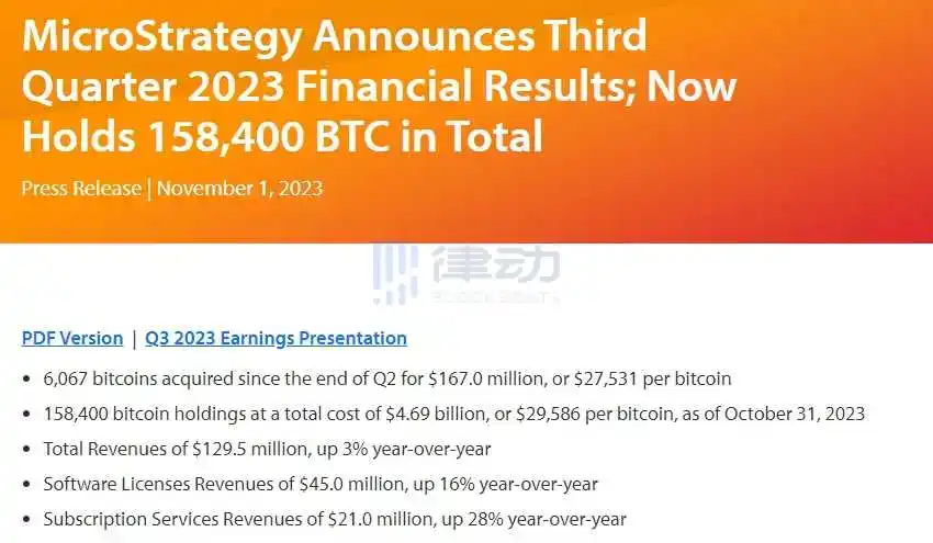 MicroStrategy 公布了 2023 年第三季度收益报告,报告显示公司在十月份以 530 万美元的价格再次增持 155 枚 BTC。 截至 2023 年 10 月 31 日,MicroStrategy 共持有 158,400 个比特币,总成本为 46.9 亿美元,持币成本为 29,586 美元。