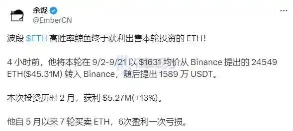 据余烬监测,某波段交易高胜率鲸鱼于 4 小时前将 24,549 枚 ETH 转入 Binance,随后提出 1589 万枚 USDT。 据分析,这笔 ETH 为该鲸鱼在 9 月 2 日至 21 日以 1631 美元均价从从 Binance 提出。此次转入或为获利出售。