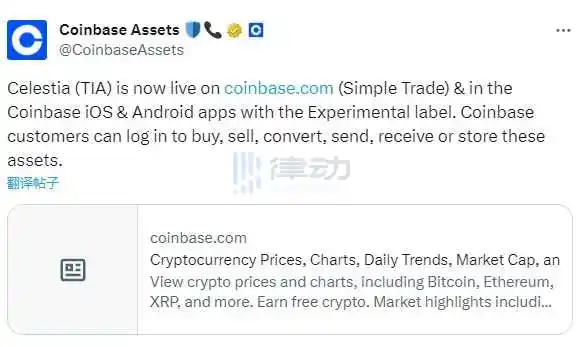 据官方消息,Coinbase 宣布已在 Coinbase.com、iOS 和安卓应用程序上线 Celestia (TIA)。目前 Coinbase 仅在 Celestia 网络上支持该代币。
