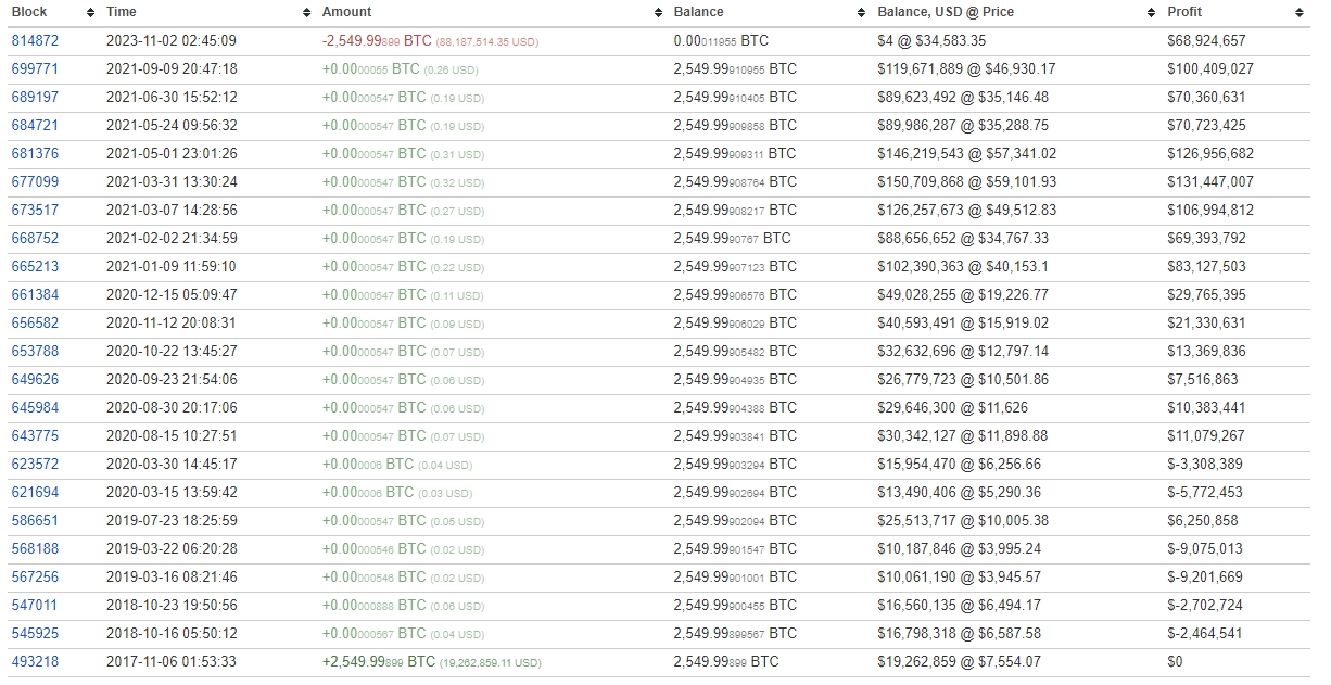 11 月 2 日,据 BitInfoCharts 数据显示,3 个同时于 2017 年 11 月 6 日休眠的比特币巨鲸地址,今日 2:45 左右转出总计约 6500 枚 BTC,按市场价获利约 1.7 亿美元。其地址分别为: