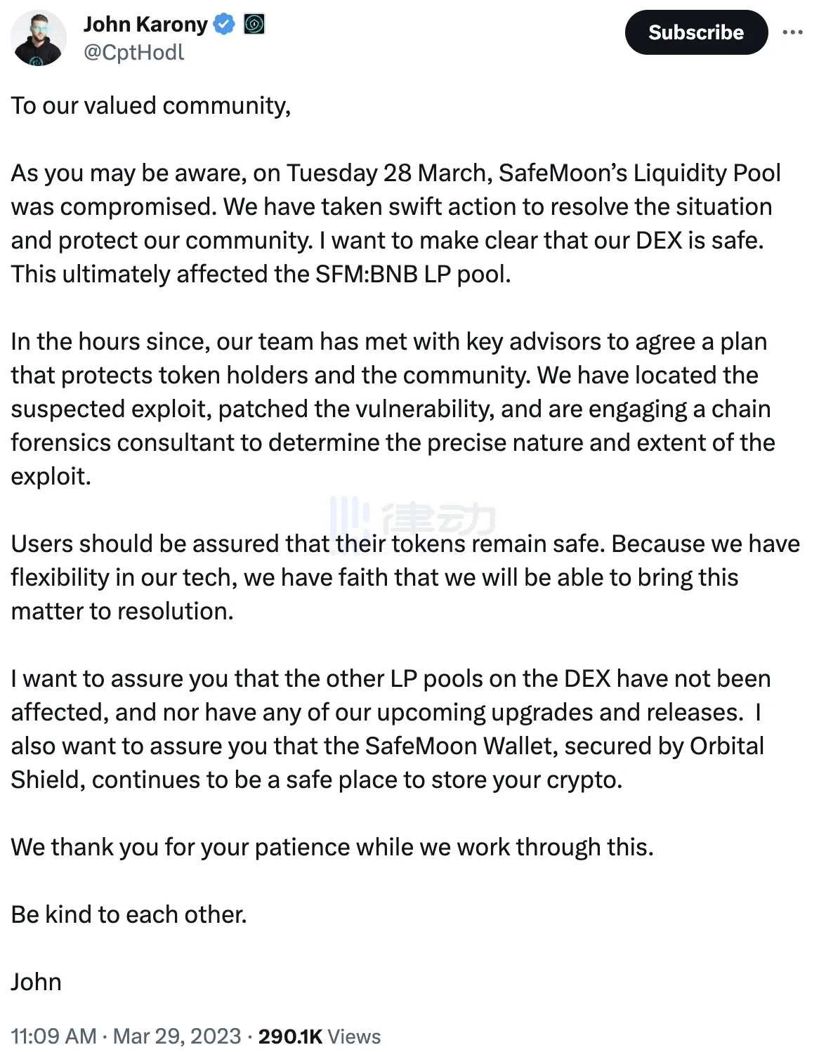 此后攻击者通过链上消息向 SafeMoon 团队表示有意愿与团队沟通归还资金,且在此后如约归还了 80% 所盗资金,同时 SafeMoon CEO Karony 也表示已修复漏洞,但也没能挽救 SFM 的下行趋势。