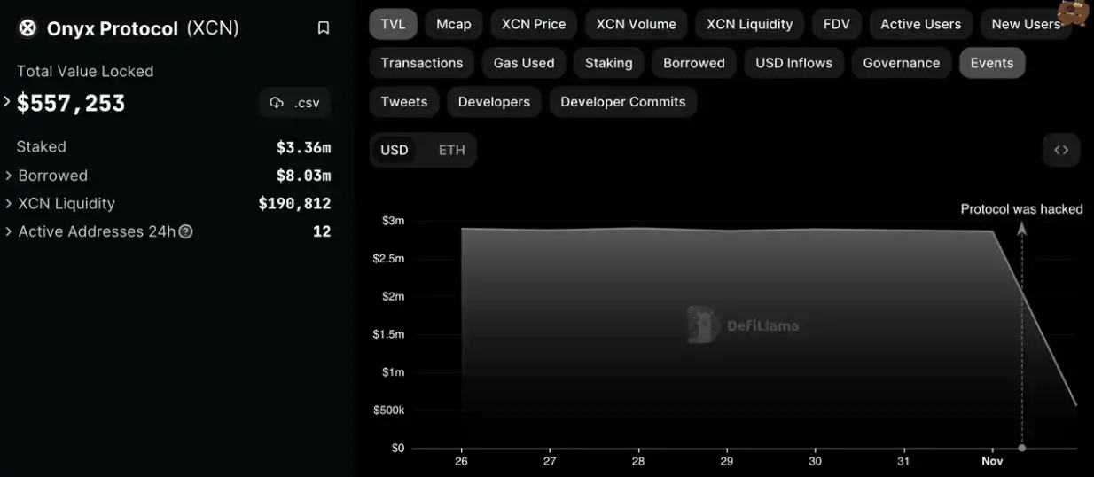 同时,从 Onyx 链上部署的合约来看,它是 Compound 衍生协议,由于遭受攻击,其 TVL 从 286 万美元下降到 55 万美元。