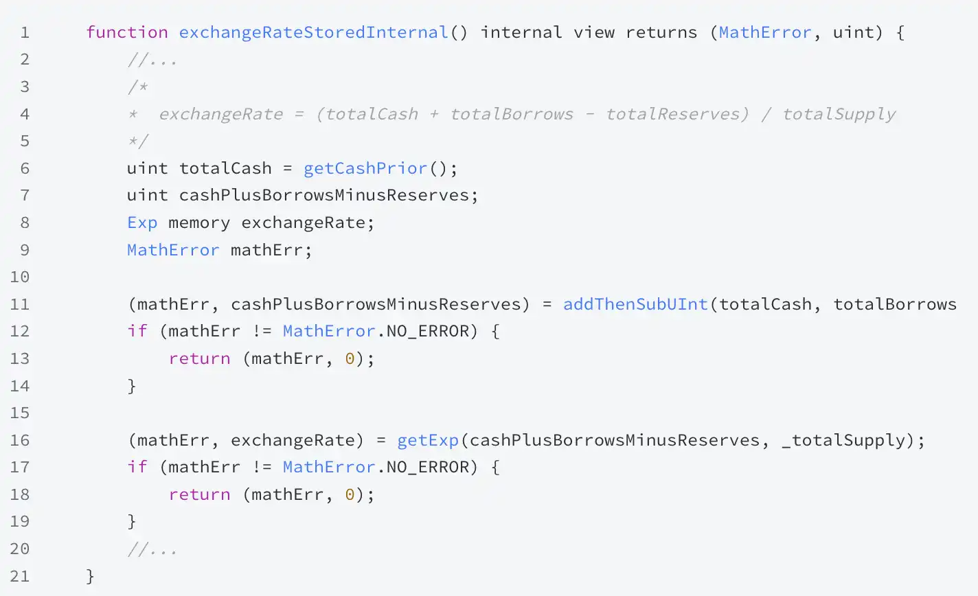 另一方面,精度损失漏洞是攻击的根本原因。黑客操纵了 totalSupply 使其变成一个极小的值即 2,并将 totalCash 增加到极大的值,即 2520870348093423681390050791471,以放大 exchangeRate,从而导致在赎回时产生计算截断。