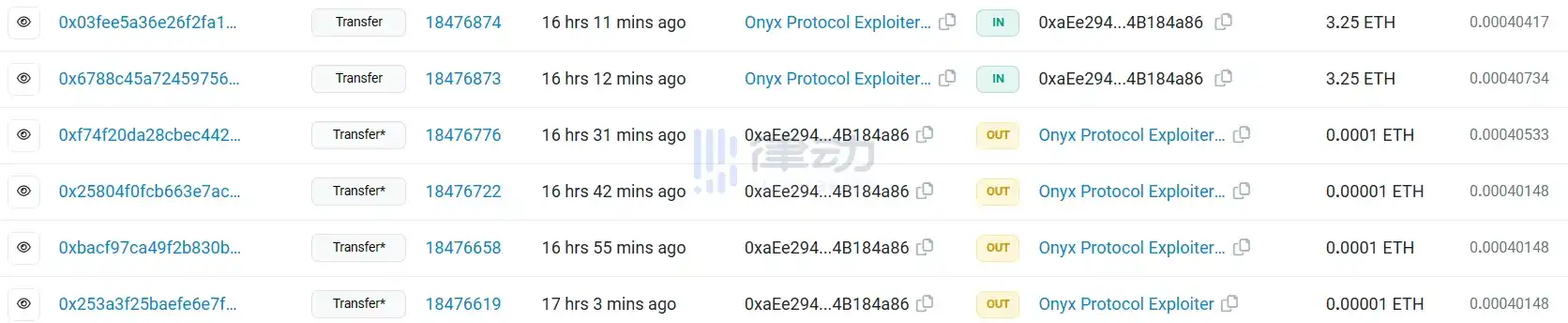 11 月 2 日,据 Scopescan 监测,DeFi 协议 Onyx 攻击者向某用户地址发送 6.5 枚 ETH。 此前该用户地址曾于链上向 Onyx 攻击者发送消息称,「Hey,如果你能送给我一些 ETH 的话,我将永远感激不尽」。