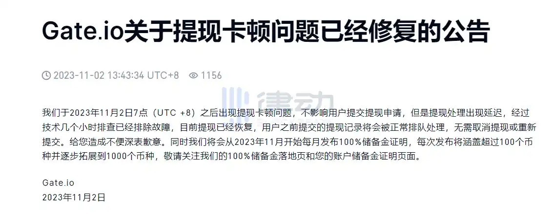 据官方公告,Gateio 表示,该平台于 2023 年 11 月 2 日 7 点(UTC +8)之后出现提现卡顿问题,不影响用户提交提现申请,但是提现处理出现延迟,经过技术几个小时排查已经排除故障,目前提现已经恢复,用户之前提交的提现记录将会被正常排队处理,无需取消提现或重新提交。据悉,Gateio 将会从 2023 年 11 月开始每月发布 100% 储备金证明,每次发布将涵盖超过 100 个币种并逐步拓展到 1000 个币种。