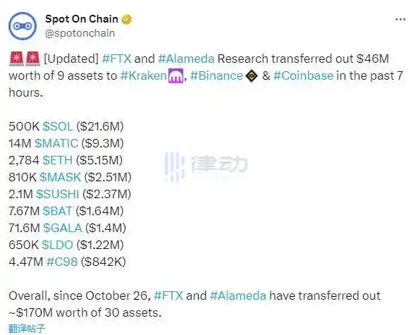11 月 2 日,据 Spot On Chain 监测,FTX/Alameda 在过去 7 小时内将价值 4600 万美元的 9 项资产转移到 Kraken、Binance 和 Coinbase。 50 万枚 SOL(2160 万美元); 1400 万枚 MATIC(930 万美元); 2,784 枚 ETH(515 万美元); 81 万枚 MASK(251 万美元); 210 万枚 SUSHI(237 万美元); 767 万枚 BAT(164 万美元); 7160 万枚 GALA(140 万美元); 65 万枚 LDO(122 万美元); 447 万枚 C98(84.2 万美元); 自 10 月 26 日以来,FTX/Alameda 已转出价值约 1.7 亿美元的 30 项资产。