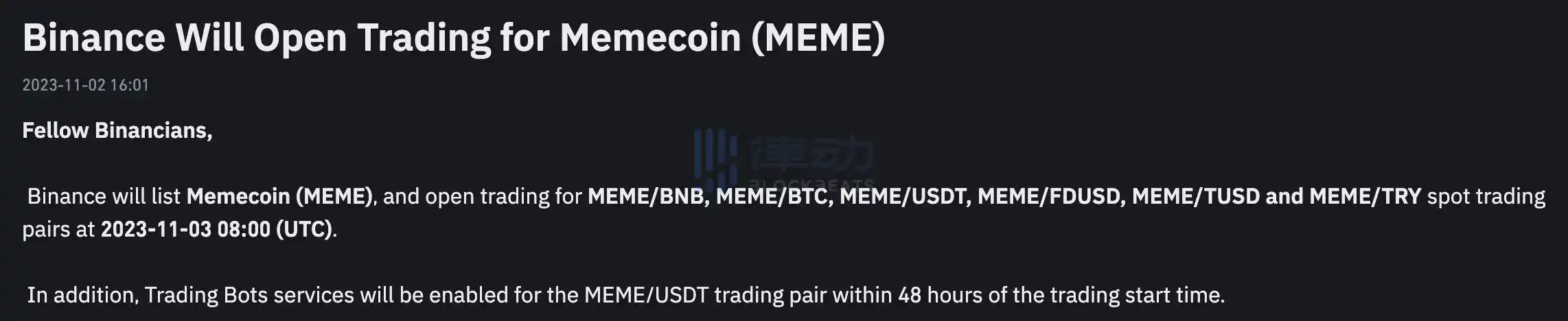 Binance 宣布将于北京时间 11 月 3 日 16:00 上线 Memecoin(MEME),并开放 MEME/BNB、MEME/BTC、MEME/USDT、MEME/FDUSD、MEME/TUSD、MEME/TRY 现货交易对交易。