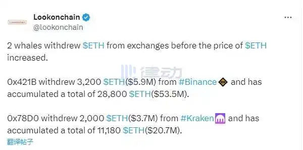 11 月 2 日,据 Lookonchain 监测,其中,2 鲸鱼地址在今晨 ETH 价格拉升之前从 CEX 提取 5200 枚 ETH。 其中 0x421B 从 Binance 提取了 3200 枚 ETH(590 万美元),累计提取 28,800 枚 ETH(5,350 万美元)。0x78D0 从 Kraken 提取 2000 枚 ETH(370 万美元),累计提取 11,180 枚 ETH(2070 万美元)。