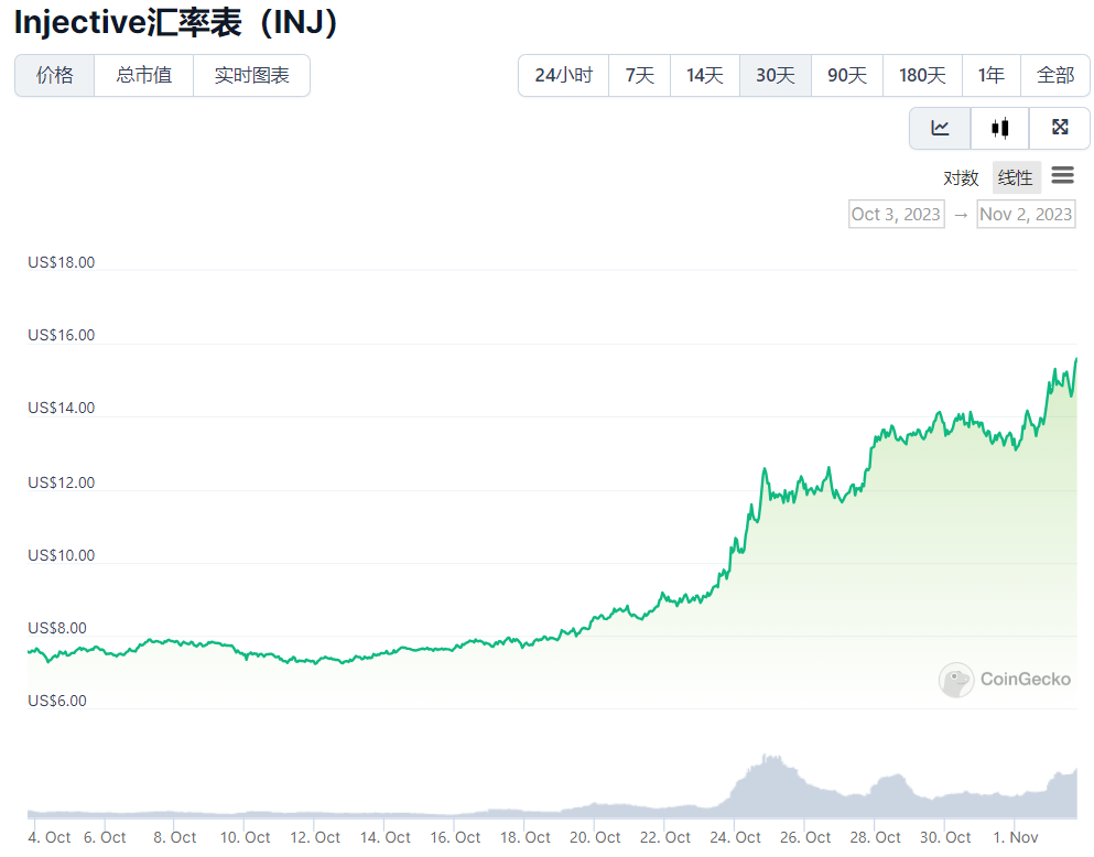 基于 Cosmos 的 Layer 1 区块链 Injective 近期因其代币 INJ 持续 1 个月的涨幅引起了社区的关注,据 Coingecko 数据显示,INJ 在近 1 个月里涨幅为 103.5%。