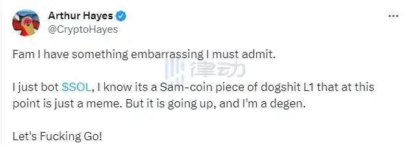 11 月 2 日,BitMEX 创始人 Arthur Hayes 于社交平台发文称,「我必须承认一件令人尴尬的事情。我刚刚购买了 SOL,虽然我知道它是名声不佳的 SBF 系代币,目前只是一个笑话。但它的价格正在上涨,而我是一个赌徒。」
