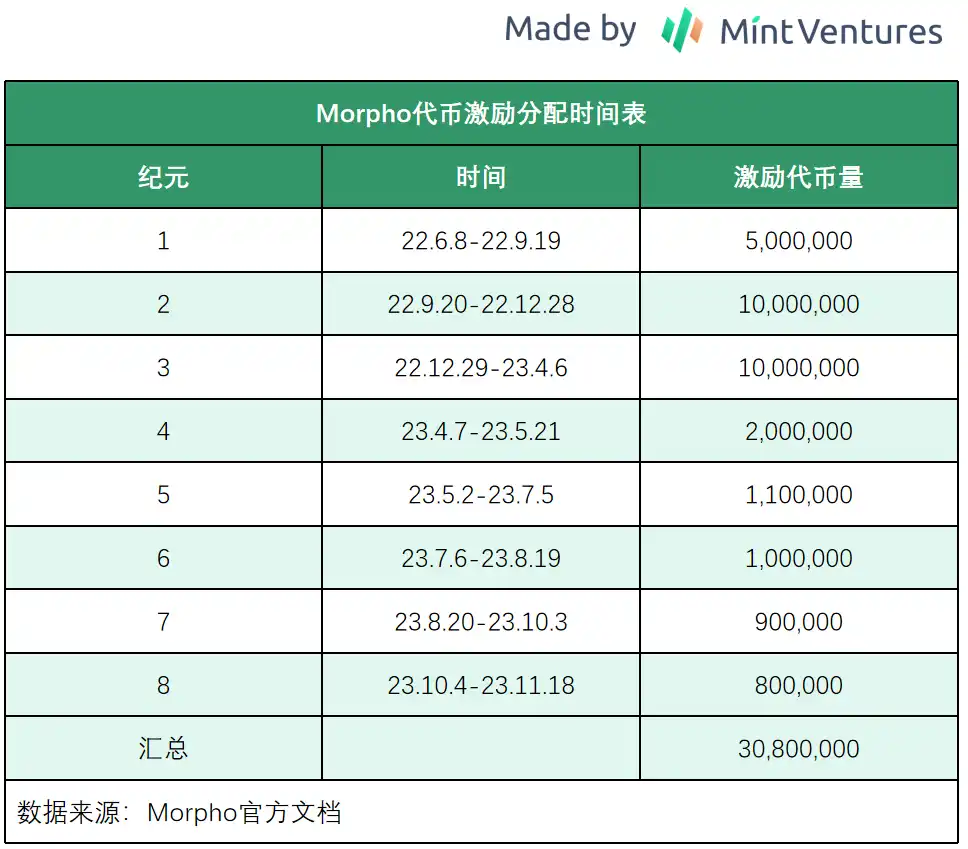在激励的行为对象上,Morpho 针对存借行为同时进行激励。不过目前 Morpho 代币在激励中的分配量不多,过去的一年多里仅分配了 3080 万枚,占到总量的 3.08%,而且从下图的激励时段和对应的代币分配量来看,官方在激励上的代币开支正在快速减少,且开支的减少并没有减缓 Morpho 业务的增长速度。