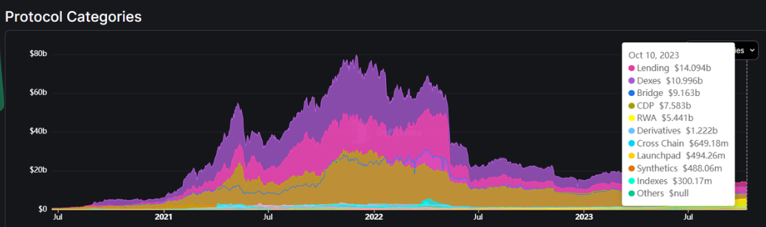 去中心化借贷的资金容量占比一直位列前茅,目前 TVL 已经超越 Dex,成为 Defi 领域资金容纳量最大的赛道。