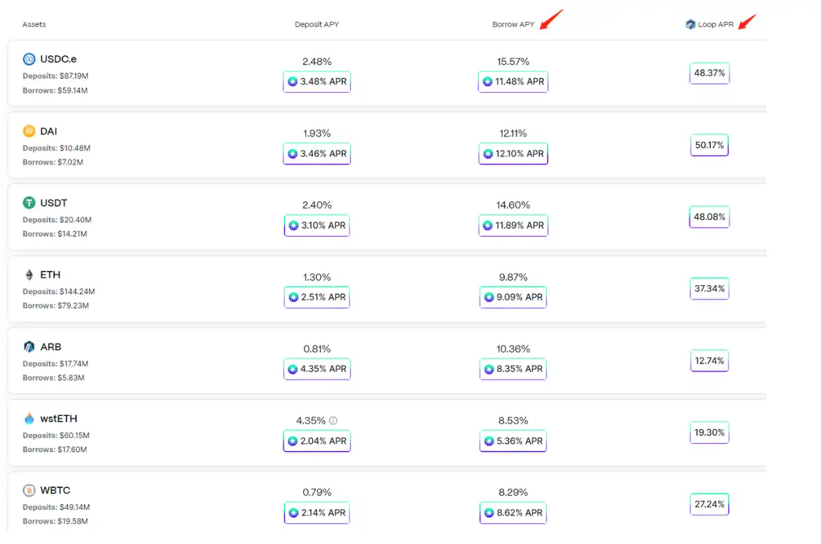 在 Radiant 的借贷市场页面,我们可以看到两处不同寻常的现象: