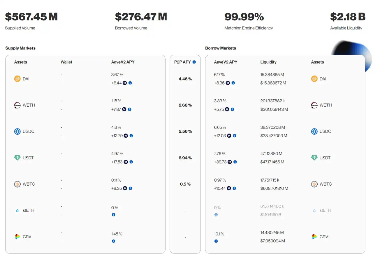Morpho 目前已上线的业务是搭建在 Aave 和 Compound 之上的点对点借贷协议(或称为利率优化器),其作用是改善 Aave 这类点对池借贷协议中存借资金没有完全匹配,导致的资金效率低下的问题。