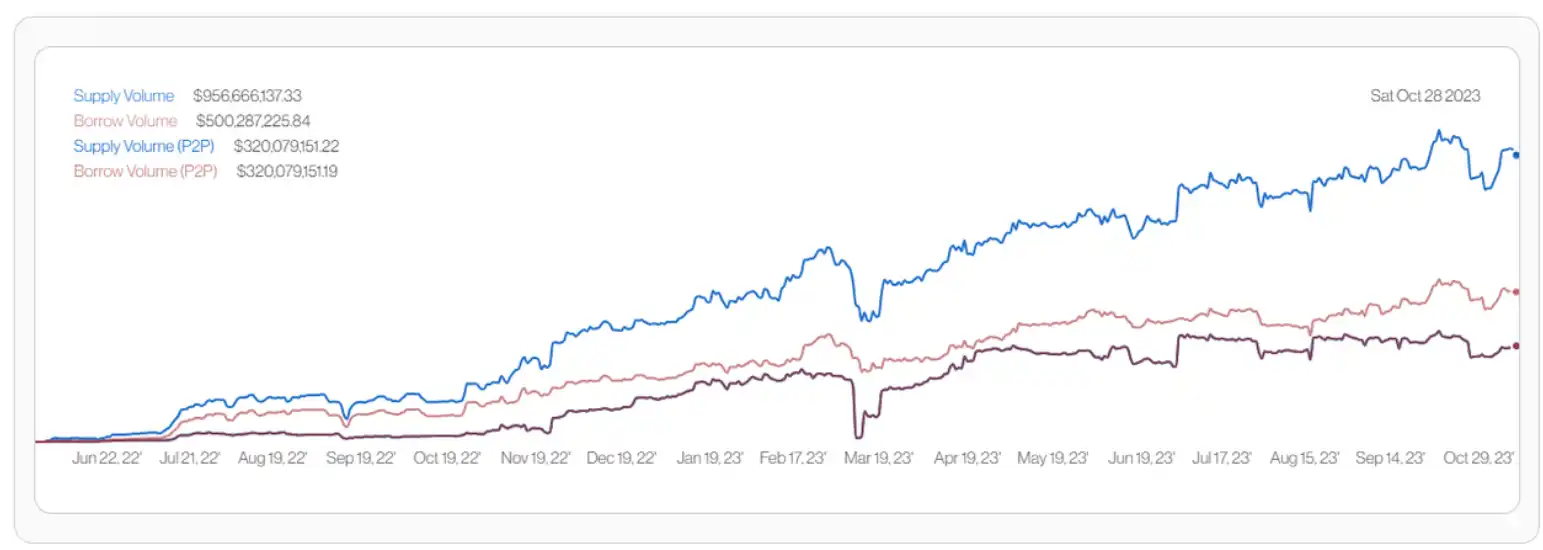 这种巧妙的设计和清晰的价值主张,让 Morpho 在上线仅一年多后,就获得了近 10 亿美金的存款规模,从数据来看仅次于 Aave 和 Compound。