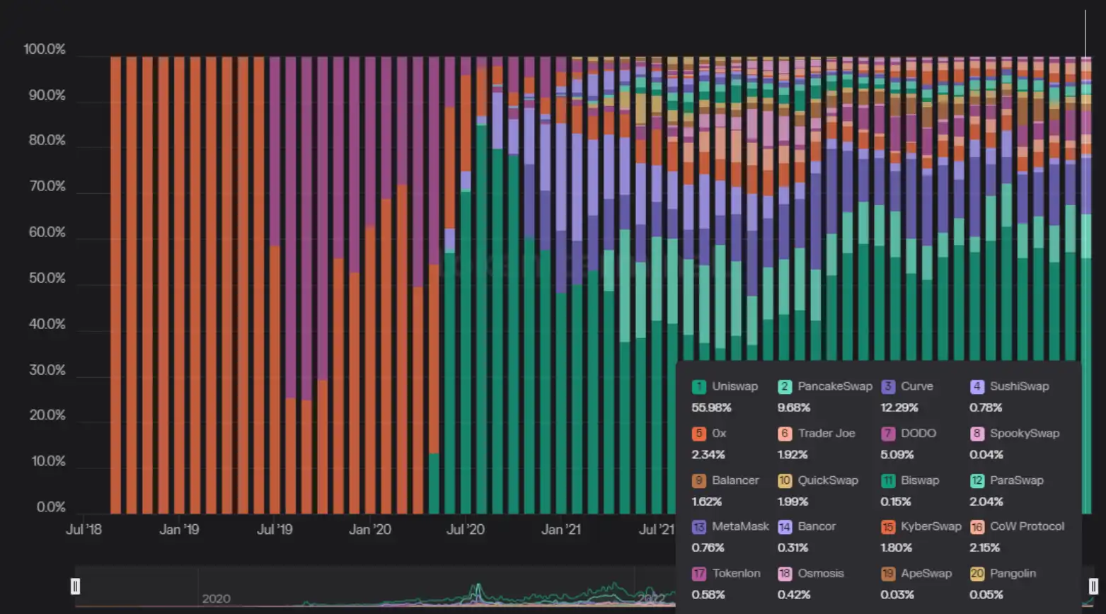 相较之下,Dex 赛道的市场份额变化则更为剧烈,头部项目 Uniswap 在上线后迅速占据到将近 90% 的交易量市场份额之后,在 Sushiswap、Curve、Pancakeswap 的快速增长下,市场份额一度跌至 37%,目前则回到 55% 左右。此外,Dex 赛道的项目总数也远比借贷赛道的项目要多得多。
