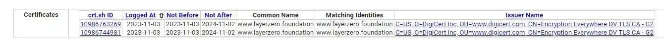 不过综合来看,最直观、热度最高的迹象则是暂未投入使用的「layerzero.foundation」域名于 11 月 3 日添加了 SSL 证书。鉴于「layerzero.foundation」域名与已确定归属于 LayerZero 项目的「layerzero.network」域名过往的更新频率高度一致,所以社区猜测该域名同属 LayerZero 项目管理。