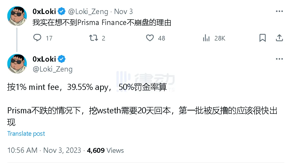 mkUSD 作为一种带有收益的稳定币,大多数用户持有 mkUSD 是为了获得持有 mkUSD 所提供的年利率。然而,加密研究员 0xLoki(@Loki_Zeng)在推文中说到「我实在想不到 Prisma Finance 不崩盘的理由」。他指出,「按 1% mint fee,39.55% apy,50% 罚金率算,Prisma 不跌的情况下,挖 wsteth 需要 20 天回本。」
