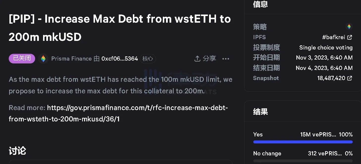 三天前,Prisma Finance 官推才刚宣布推出首个提案 PIP-001,旨在将 Lido Finance 的 wstETH 金库债务上限从当前的 1 亿枚 mkUSD 增加到 2 亿枚 mkUSD,允许更多用户参与铸造 mkUSD。