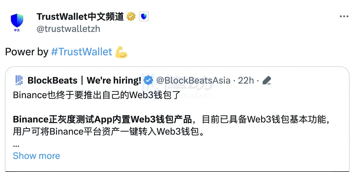 同时,Trust Wallet 中文频道转发 的推文提到,Binance 的 Web3 钱包由 Trust Wallet 团队提供支持。