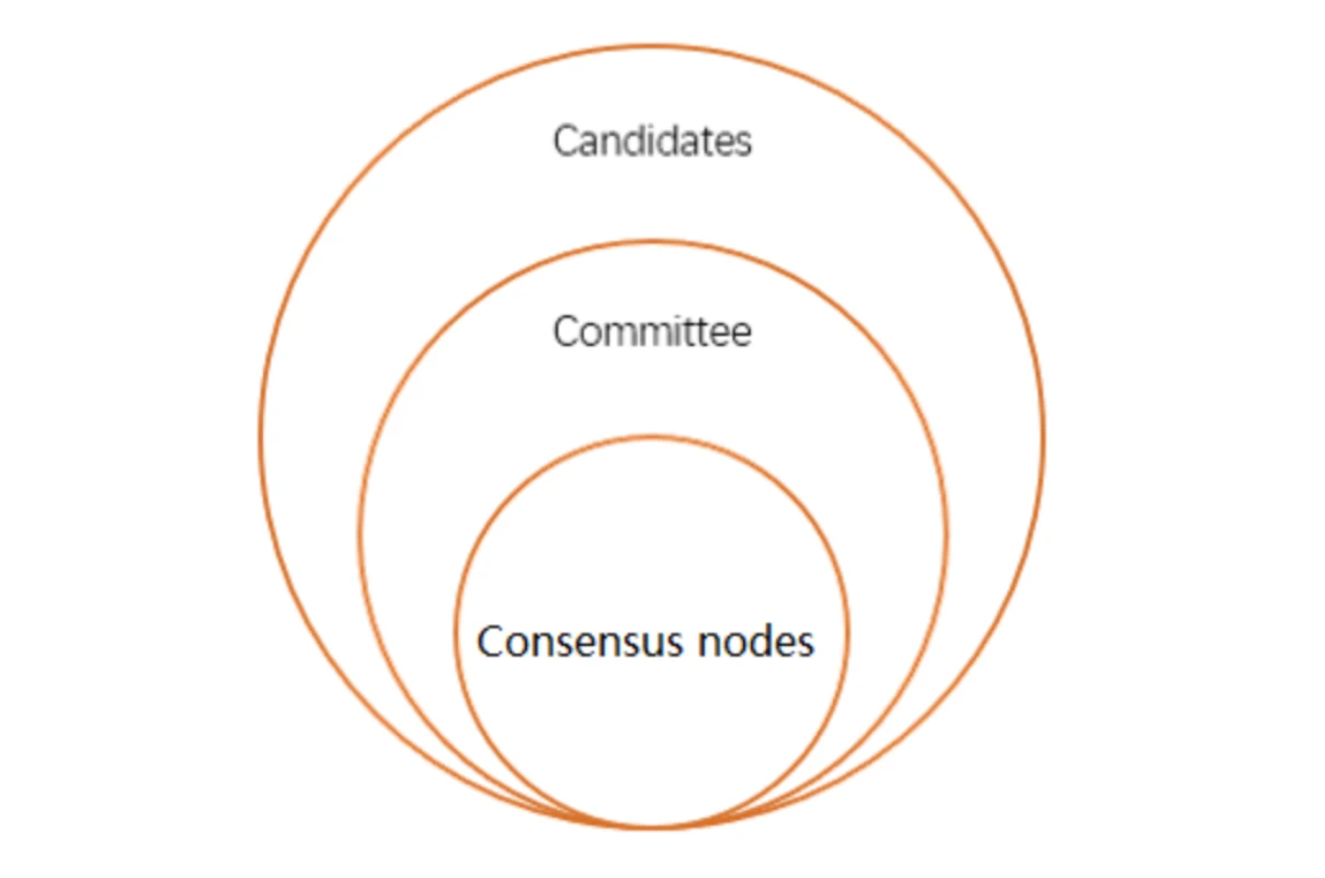 Neo N3 治理模式由候选人、委员会成员和共识节点组成。其中,委员会负责主网参数调整和链上环境维护;共识节点负责打包交易并生成区块。委员会成员和共识节点从一定数量的得票最多的候选人中选出。根据下图看新的治理机制。