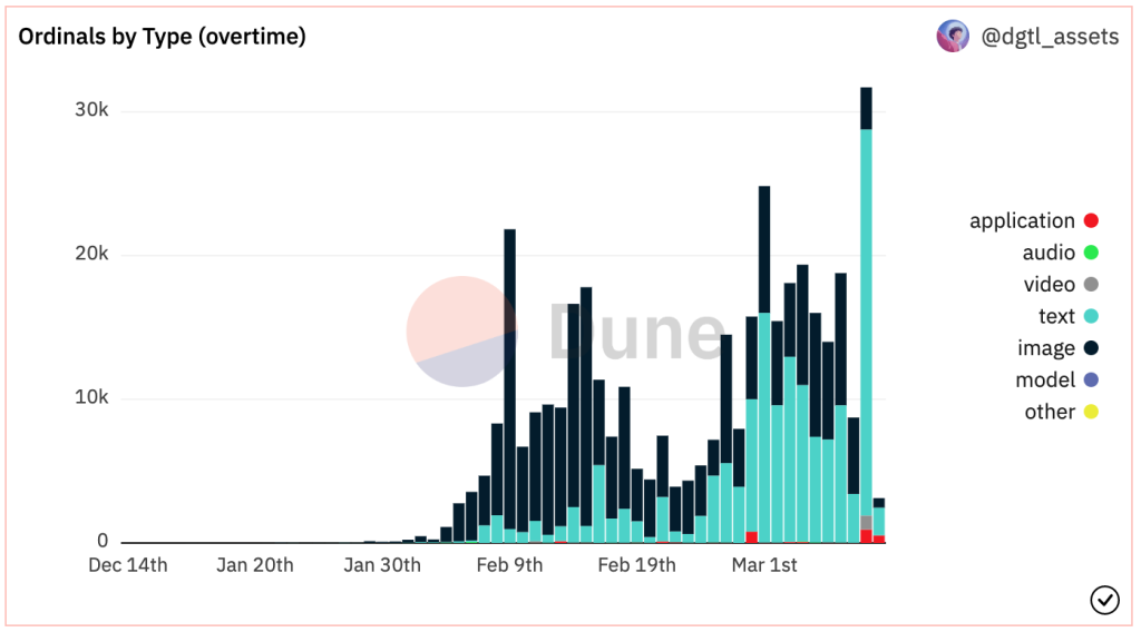 BRC-20 让比特币网络再一次疯狂。3 月 9 日一天有超过 30000 个「铭文」被铸造,其中文本类型「铭文」数量接近 27000 个。