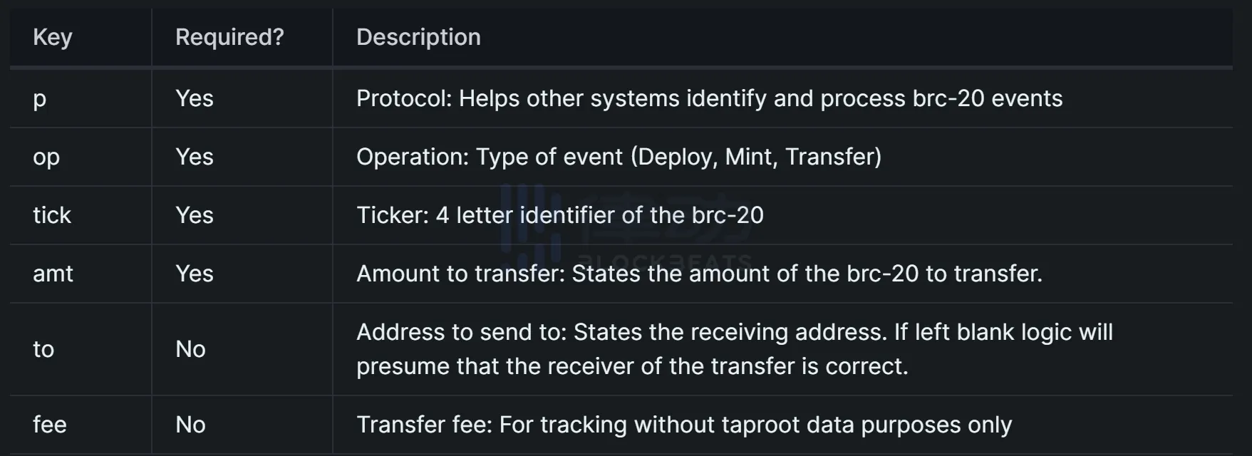 「fee」:转账费用。非必须包含的关键词,该关键词定义转账费用数额。目前,该关键词只是为了用于 Dune 看板的数据跟踪测试(在没有 Taproot 数据的情况下)。