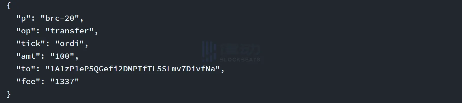 使用 Ordinals 协议刻录下图所示文本来转账 BRC-20 Token: