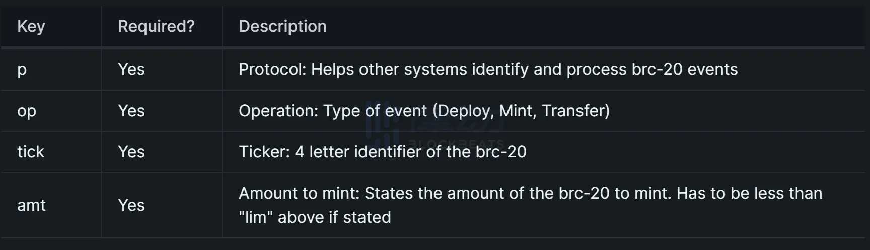 「tick」:BRC-20 Token 标识。必须包含的关键词,该关键词定义 BRC-20 Token 名称,由 4 个字母组成。在这里「tick」的内容为「ordi」意味着铸造的 BRC-20 Token 为 $ordi。