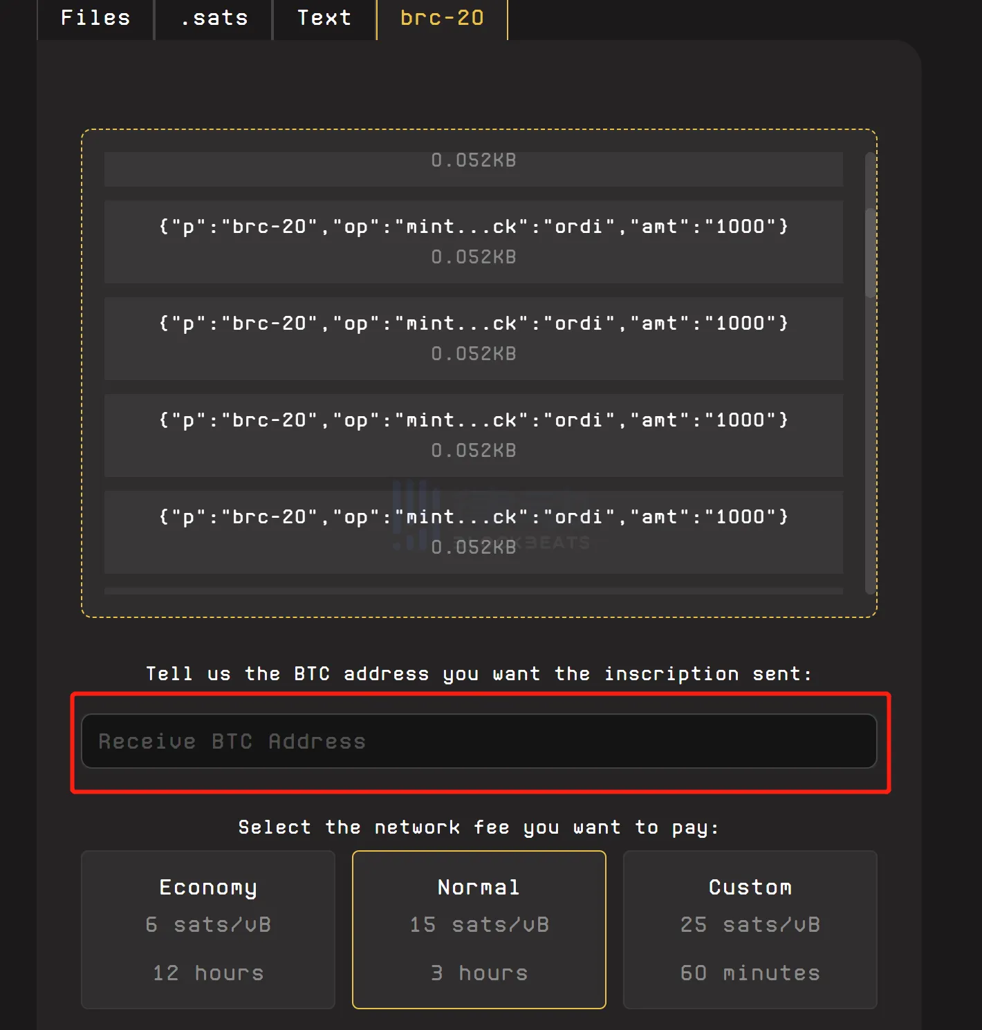 「Copy address below」下方显示的是打款地址,「Total Amount」显示的是打款金额。使用自己的比特币钱包完成转账以后等待铭文到账即可。