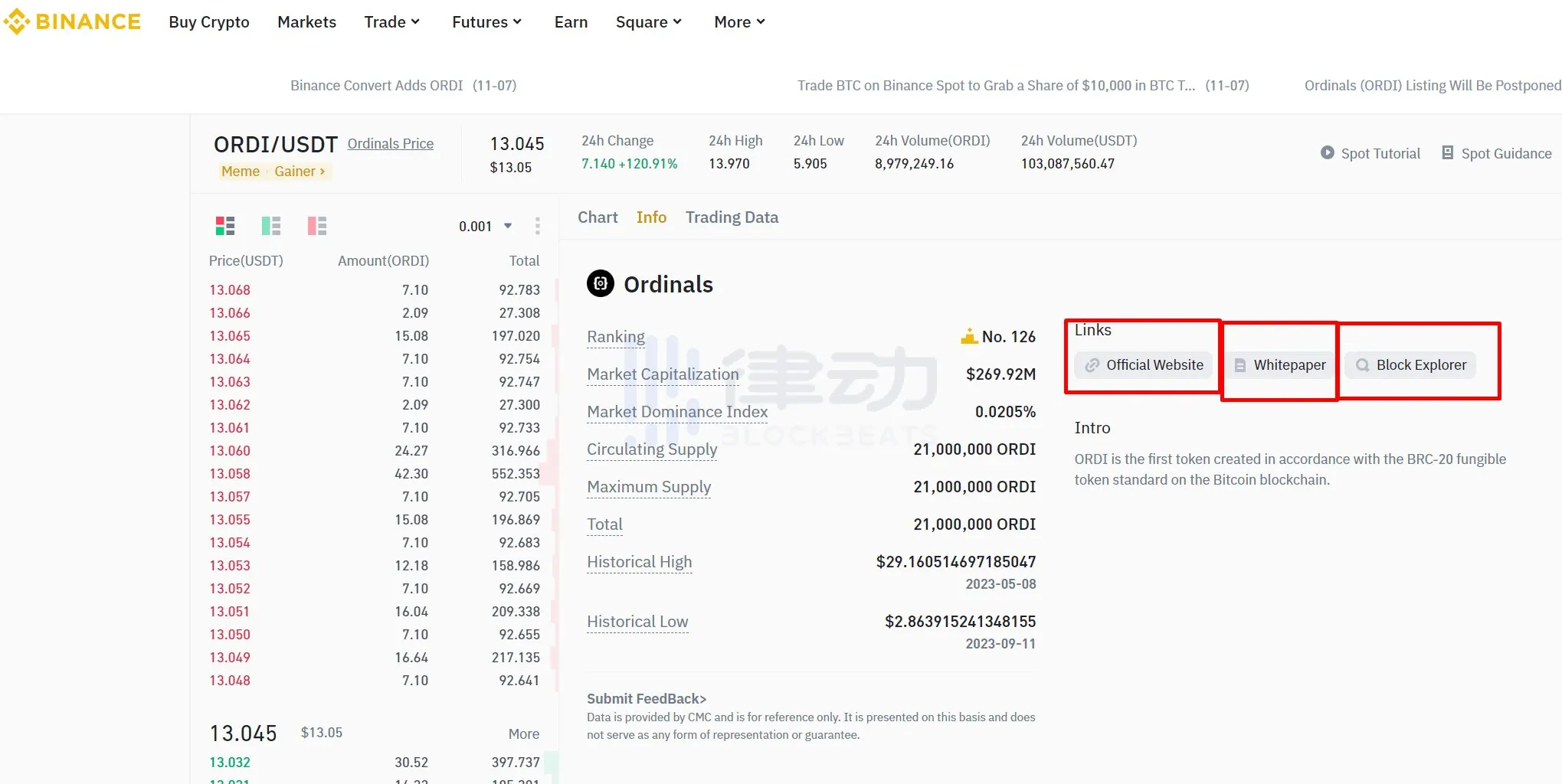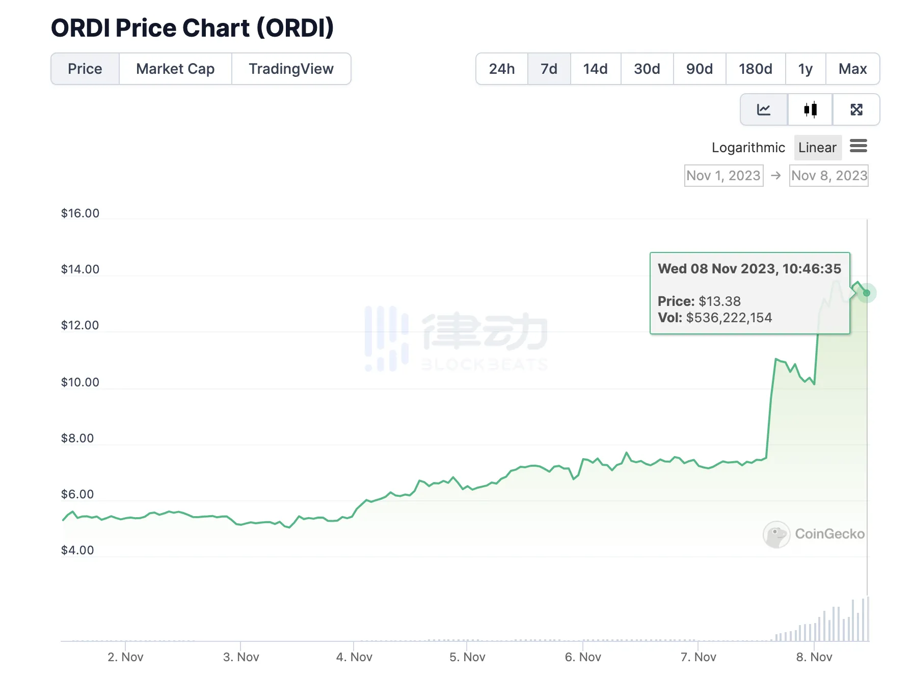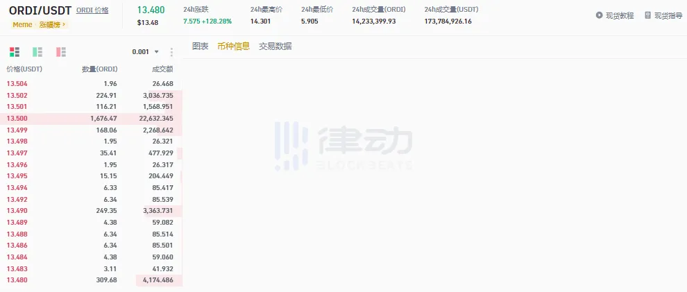 而随着昨日 Binance 上线 ORDI 交易,ORDI 的价格已经突破了 13 美元。