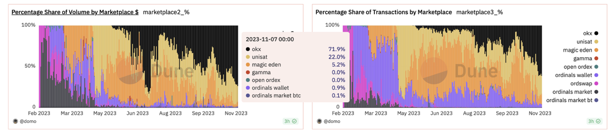 今年 5 月底,OKX Web3 钱包全面上线 Ordinals 市场,凭借其丝滑的产品体验、最全面的功能、最优的流动性、以及 0 手续费等优势,一经推出就收获好评如潮,成为入户入局比特币生态的首选平台。据 Dune 数据显示,当前比特币 Ordinals 交易占比近 70%,位列行业第一。