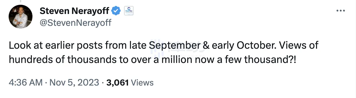 几个月过去,社区也没能见到 Steven Nerayoff 给出的实质性指控。而 Nerayoff 甚至在最近的推文里称 Twitter 对他进行了流量限制(banned & tags),「查看九月底和十月初的早期帖子,浏览量几十万到上百万现在几千?!」