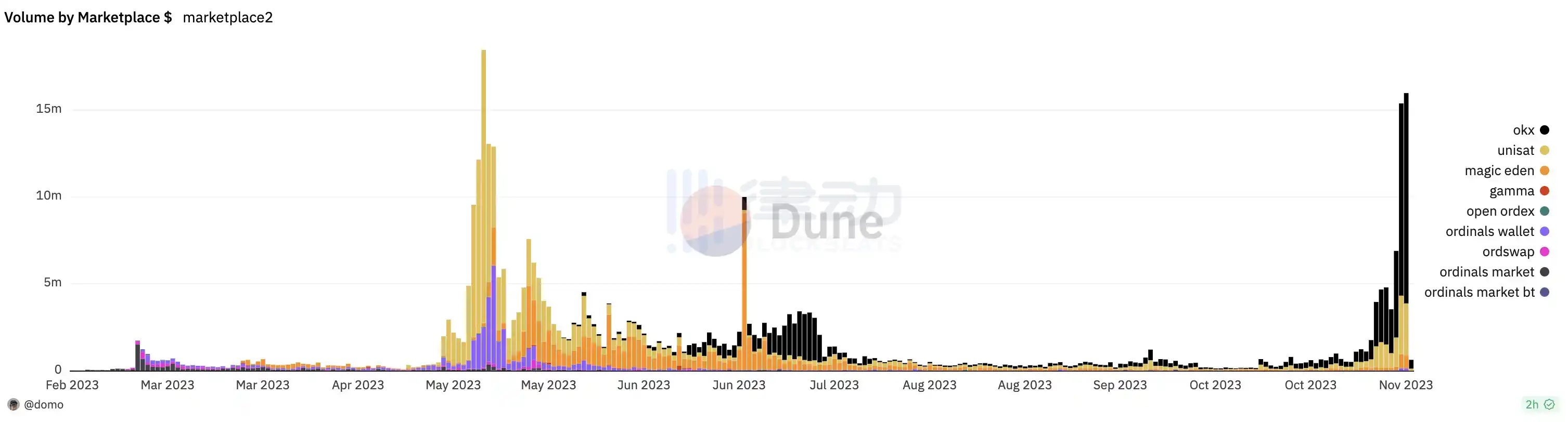 11 月 9 日,据 Dune 数据显示,昨日比特币 NFT 交易额逼近 1600 万美元,创下历史第二高位。截止发稿,比特币 NFT 历史交易额已达 397,806,069 美元。