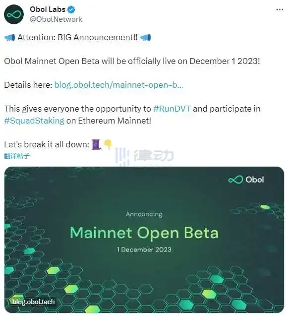分布式验证器技术提供商 Obol Labs 主网公测将于 12 月 1 日上线