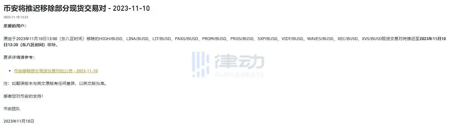 据官方公告,Binance 宣布原定于 11 月 10 日 13:00(东八区时间)移除的 HIGH/BUSD、LINA/BUSD、LIT/BUSD、PAXG/BUSD、PROM/BUSD、PROS/BUSD、SXP/BUSD、VIDT/BUSD、WAVES/BUSD、XEC/BUSD、XVS/BUSD 现货交易对将推迟至 2023 年 11 月 10 日 13:30(东八区时间)移除。