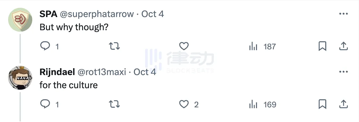 不过,Rijndael 部署 Sophon 是否真的为了完善 BRC-20 的规则不得而知,因为他在回复为什么要这么做时给出的答案是——「为了文明」。