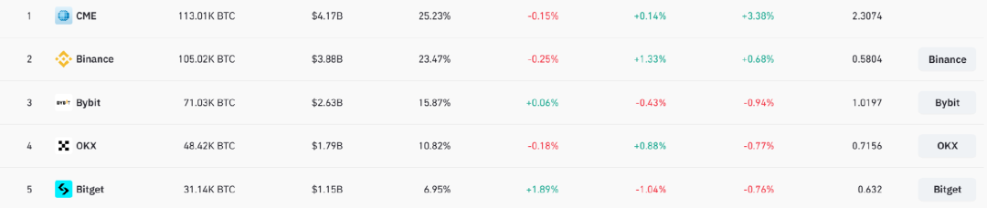 Coinglass 最新数据显示,CME 比特币期货未平仓合约约 41.7 亿美元,排名第一,其次为 Binance(38.8 亿美元)、 Bybit(26.3 亿美元)、OKX(17.9 亿美元),而 Bitget(11.5 亿美元)紧随其后,位列第五名。