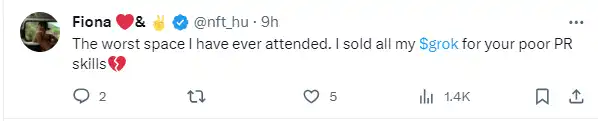 在这则推文发出 45 分钟后,GROK 团队紧急发起了 space 作为回应,但并没有给出有效的信息,难以平息 GROK 投资者的情绪,有人评论道,「这是我参加过的最糟糕的 space。为了你糟糕的公关技巧,我卖掉了我所有的 GROK」。