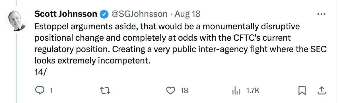 考虑到存在 CME 以太期货市场和多个基于期货的以太坊 ETF,批准的逻辑似乎是相当可转移的。甚至是对于以太在美国的监管方法也是非证券基础的。Gensler 或未来的监管机构改变之前处理的可能性是不太可能的,有很多原因。