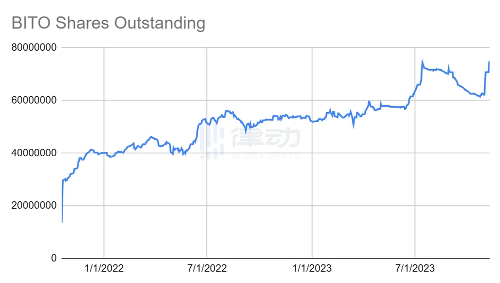 外部资本正利用 BITO 提前炒作现货 BTC ETF 的推出,而增加的流通股份可以作为市场对现货 BTC ETF 批准的看法的代理,但似乎并没有真正的外部需求对比特币期货产品感兴趣,特别是考虑到在最近一波现货 ETF 批准炒作之前,流通股份的数量即将跌破 6000 万大关。
