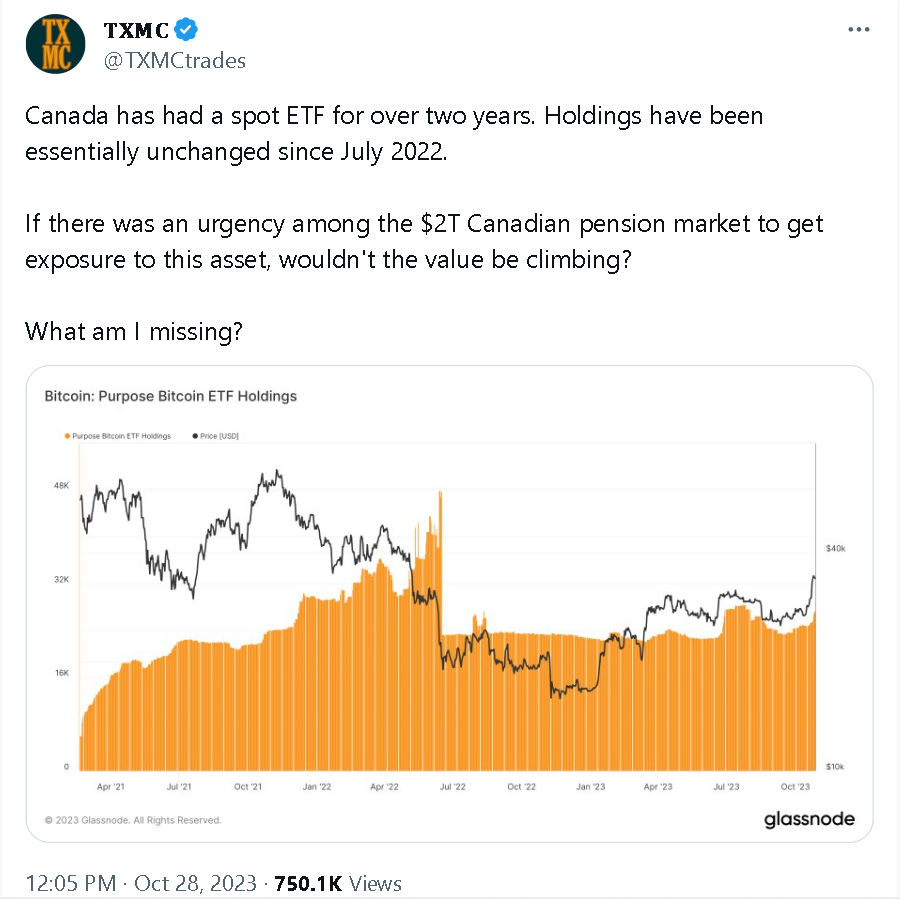 自第三季度以来,比特币现货 ETF 的讨论热度,随着全球最大的资产管理公司贝莱德等机构的申请不断攀升。随之而来的对以太坊现货 ETF 的期望也随之提高。不少社区人士认为比特币现货 ETF 的通过会为加密行业带来巨大利好,但 Bankless 分析师 Jack Inabinet 以加拿大市场情绪和灰度信托基金为例,指出比特币 ETF 的需求已经停滞不前。 将原文编译如下:
