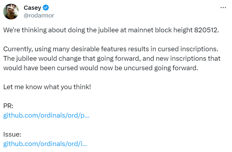 但是说「诅咒铭文」从此绝版也是不准确的,因为「诅咒铭文」本身就是「Ordinals 协议混乱的包罗万象」,就像 Windows 系统的 Bug 是无穷无尽的,修了一万个老 Bug,还会有无数个未被发现的新 Bug。在未来,可能还会有「禧年 (Jubilee)」2.0、3.0... 也因此,Ordinals 协议 Contributor @cbspears 认为,本次提出「禧年 (Jubilee)」计划为时过早,因为在之后几乎肯定会发现新的导致「诅咒铭文」出现的特殊情况。