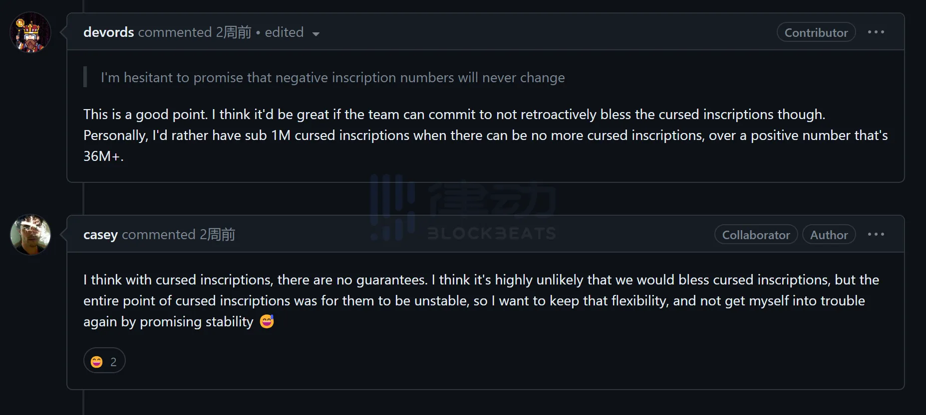 另外有两点值得注意的。首先,Casey 本人表示不太可能对「诅咒铭文」进行追溯「祝福」,即不会把先前的负数铭文编号转为正数。