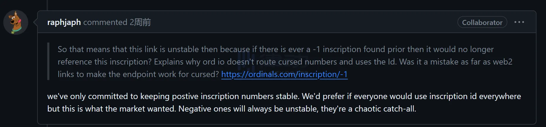 其次,「诅咒铭文」的编号是「不稳定」的,因为特殊情形将在什么时候出现或是被发现都是不可预测的。比如一个错误情形在未来被发现,但实际已经存在很久而且有铭文因此被 Inscribe 出来,那么负数铭文的编号顺序就可能会发生变动。Ordinals 协议首席维护者 @raphjaph 表示,只致力于维护正数铭文编号的稳定。