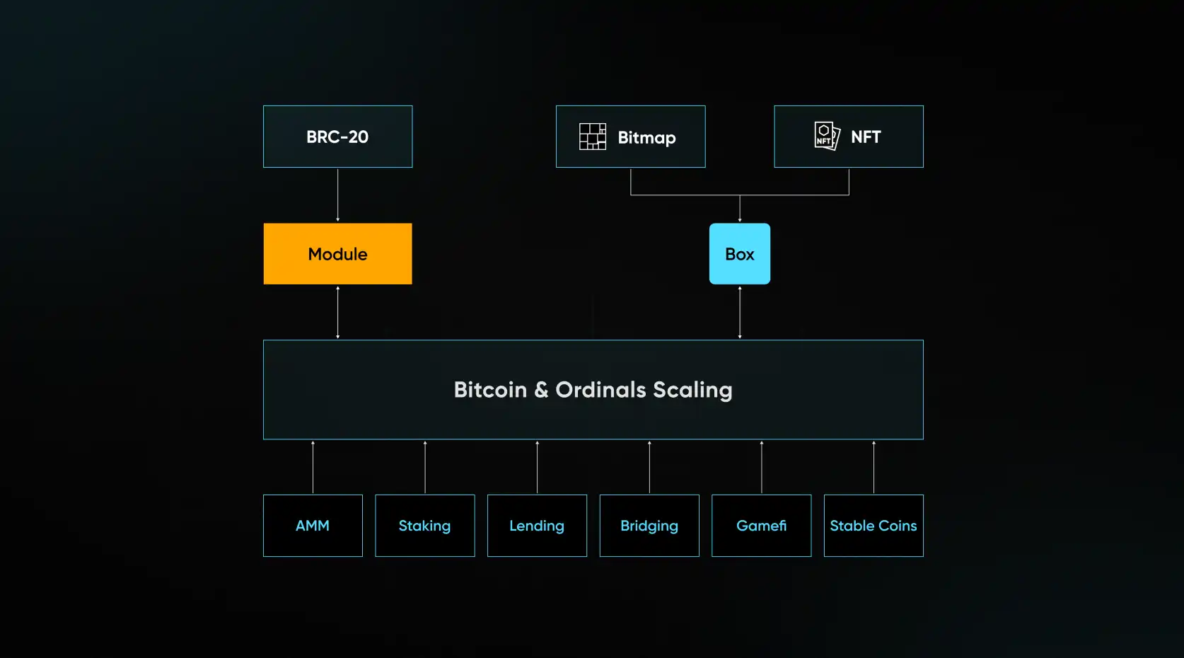 相比于 BitVM 和 RGB 等方案暂时未有落地的可能,RCSV 提出了更加务实的方案来实现比特币网络的扩容。首先是从一层如何将资产迁移到二层,和 Unisat 一样使用 Module 的解决方案,保证用户资产的安全的同时,让资产进入一个低费率/高效率的交互环境。同时在 Module 的下一层再实现完整的一套虚拟机环境,通过账户模型的方式让比特币一层的资产可以在二层上实现智能合约、AMM、质押、借贷等金融产品需求。