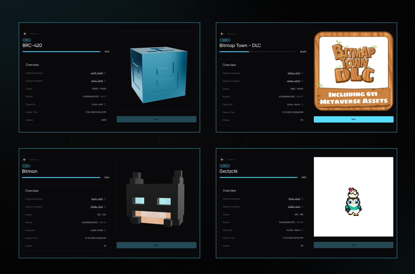 11 月 13 日,Ordinals 总铭文数量超过 4000 万,各个协议都迎来了复苏,其中就包括 BRC-420。与其他代币协议不同,420 协议(又称元宇宙协议)专注将「链上铭文模块化」,资产并不是「4 字母」的同质化代币,而是比特币上独有的新型资产。