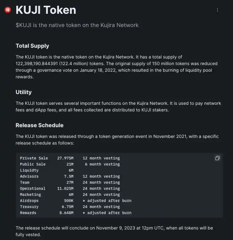 此外,代币经济学方面,2023 年 11 月 9 日 Kujira 解锁了最后一批已归属的 KUJI 代币,这也意味着大约 1.22 亿枚总量的 KUJI 代币现在全部实现流通。